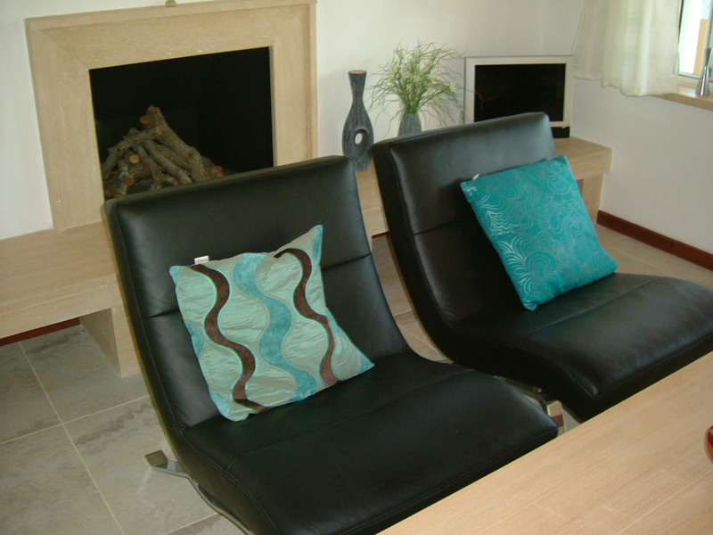 - Lounge with a fire-place, TV-set, integrated DVD player, shelves, sofas